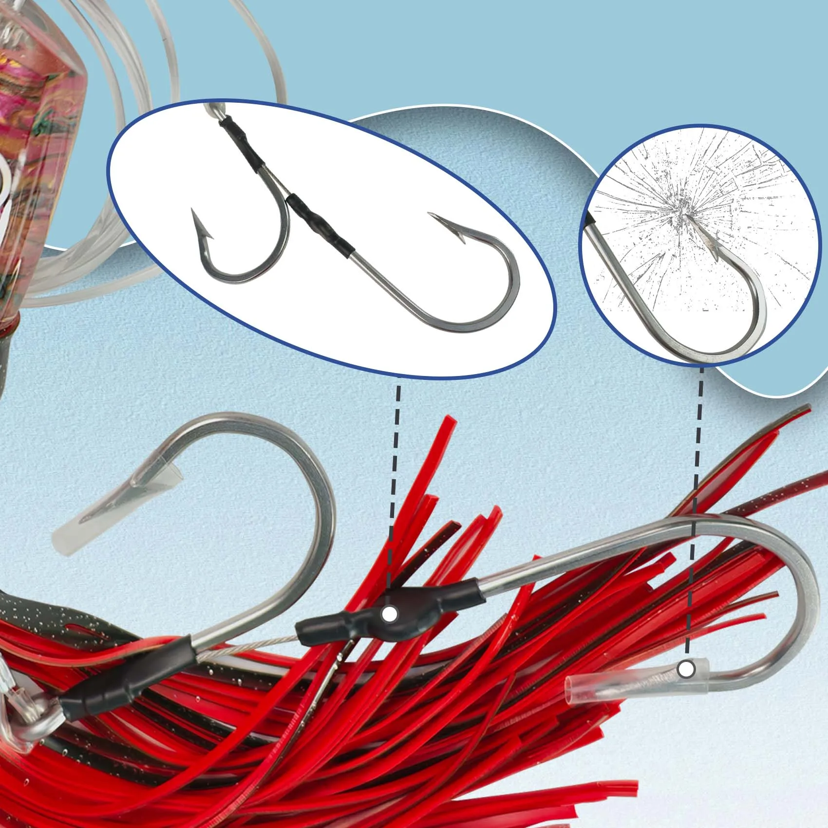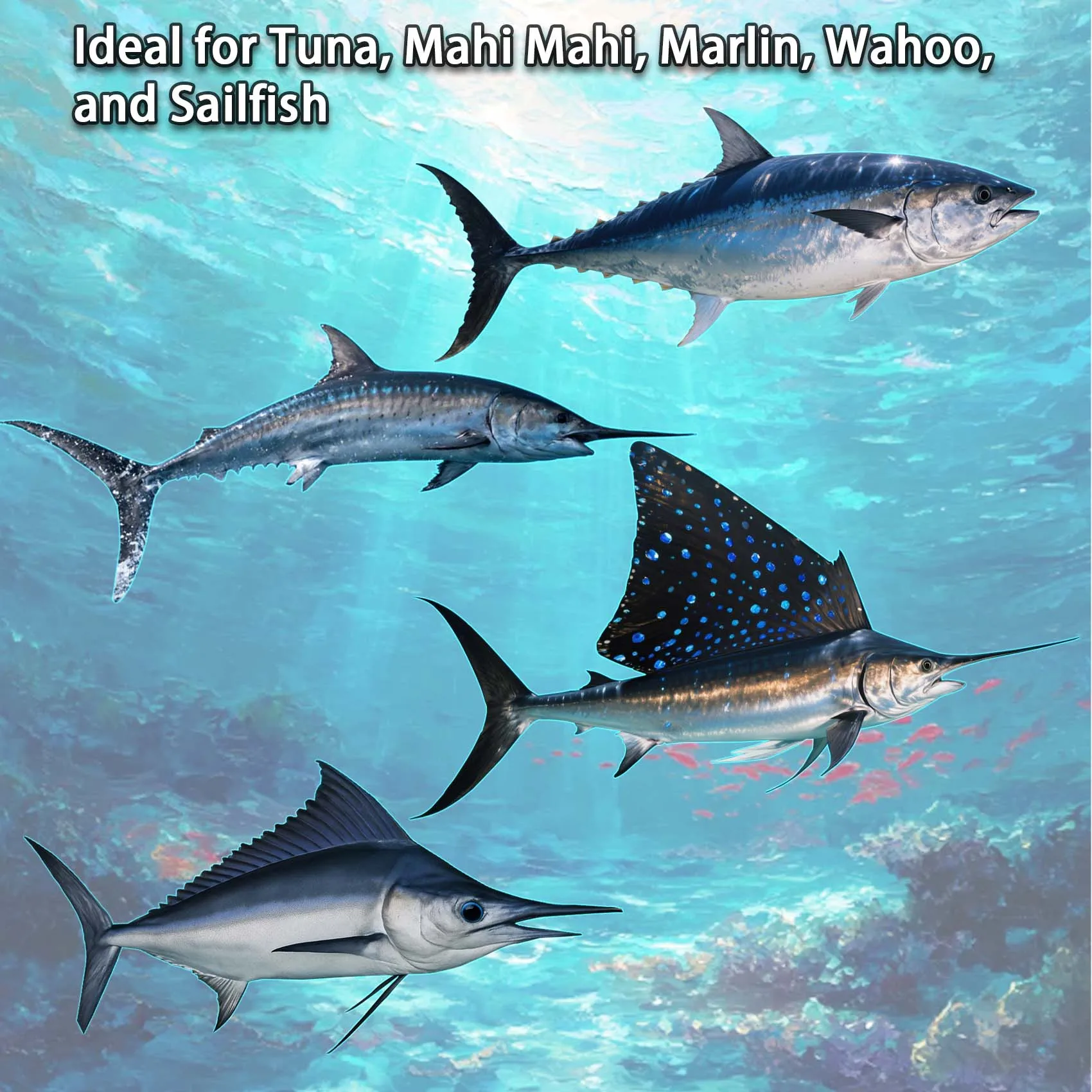 Rigged with strong double hooks and heavy-duty leader, ideal for targeting Tuna, Mahi Mahi, Marlin, Wahoo, and Sailfish on offshore trolling trips.