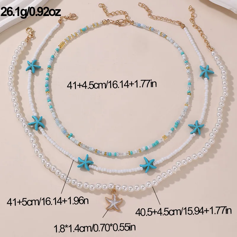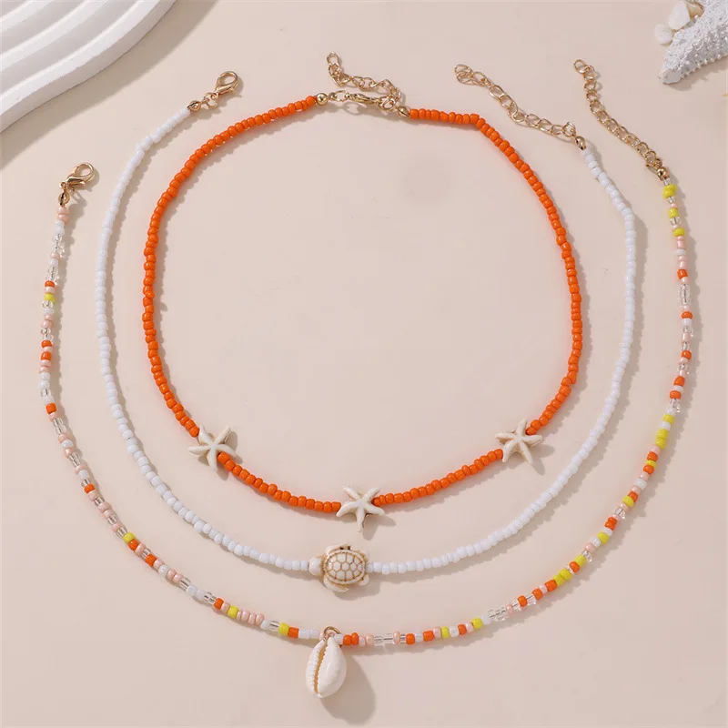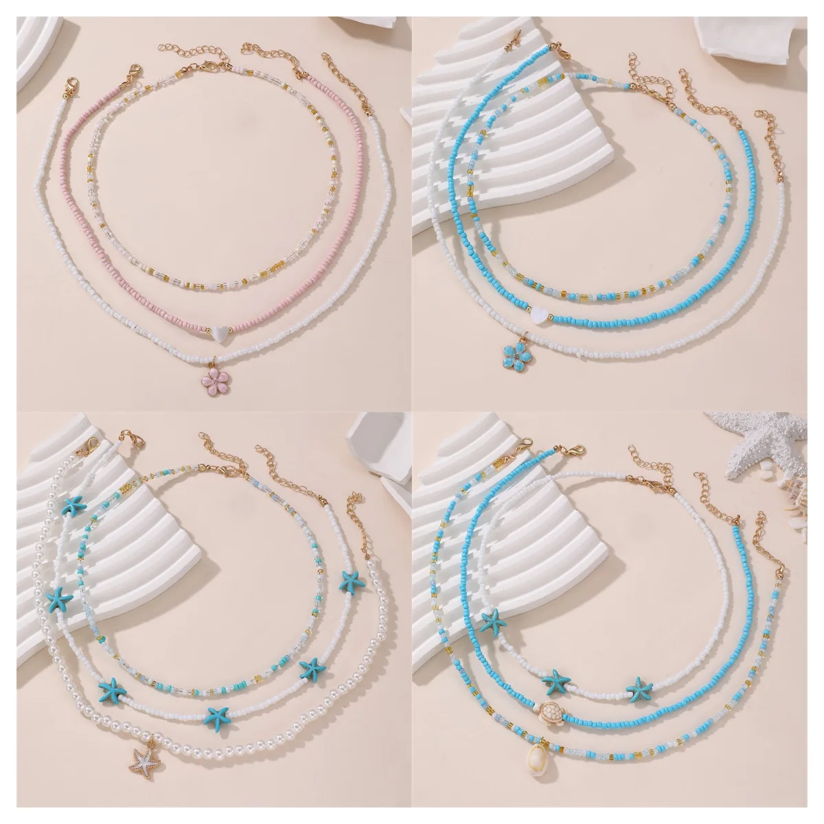Bohemian Multilayer Rice Bead Chain Clavicle Necklace Vintage Acrylic Turtle Starfish Shell Pendant Choker Women Beach Jewelry