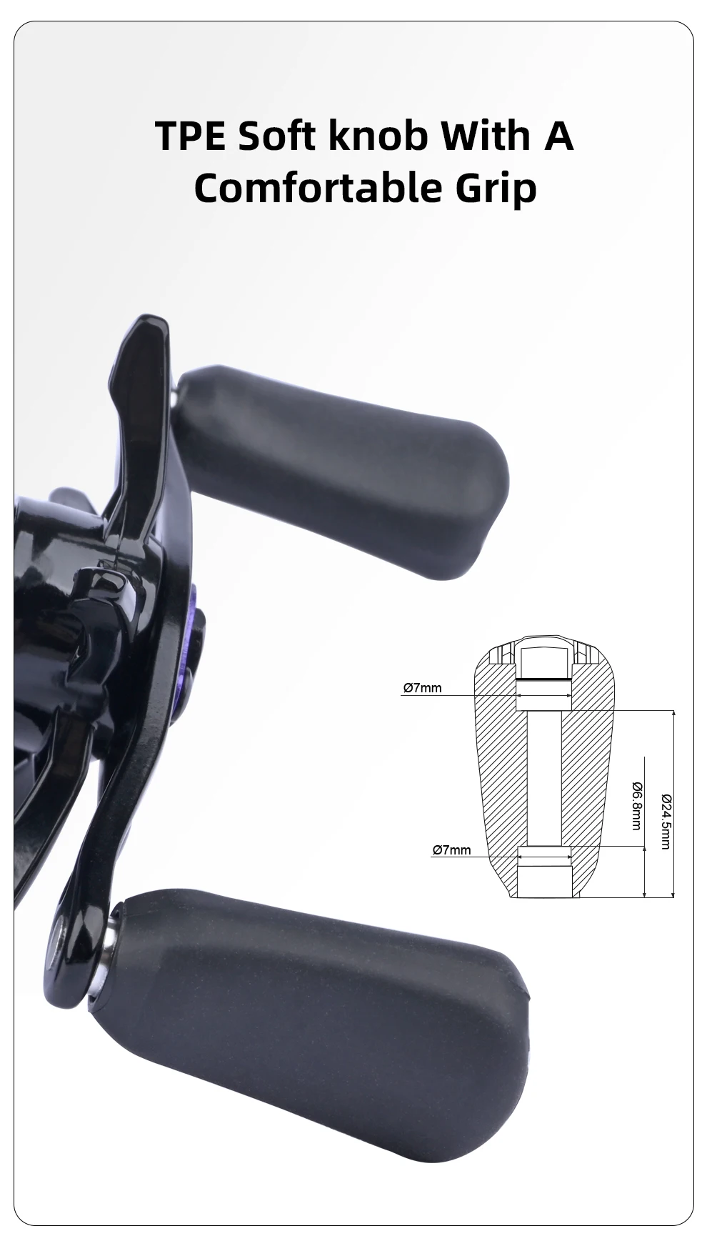 Featuring a streamlined I-shaped design with a strong grip, the rear of the handle is slightly open, making it easier for fingers to wrap around and exert force.The curvature of the fingertip contact surface increases the contact area, preventing fatigue even during a long time of gripping.TPE material, skin-friendly and smooth, maintains optimal grip even in wet or slippery conditions, ensuring you never miss a chance to catch a fish.