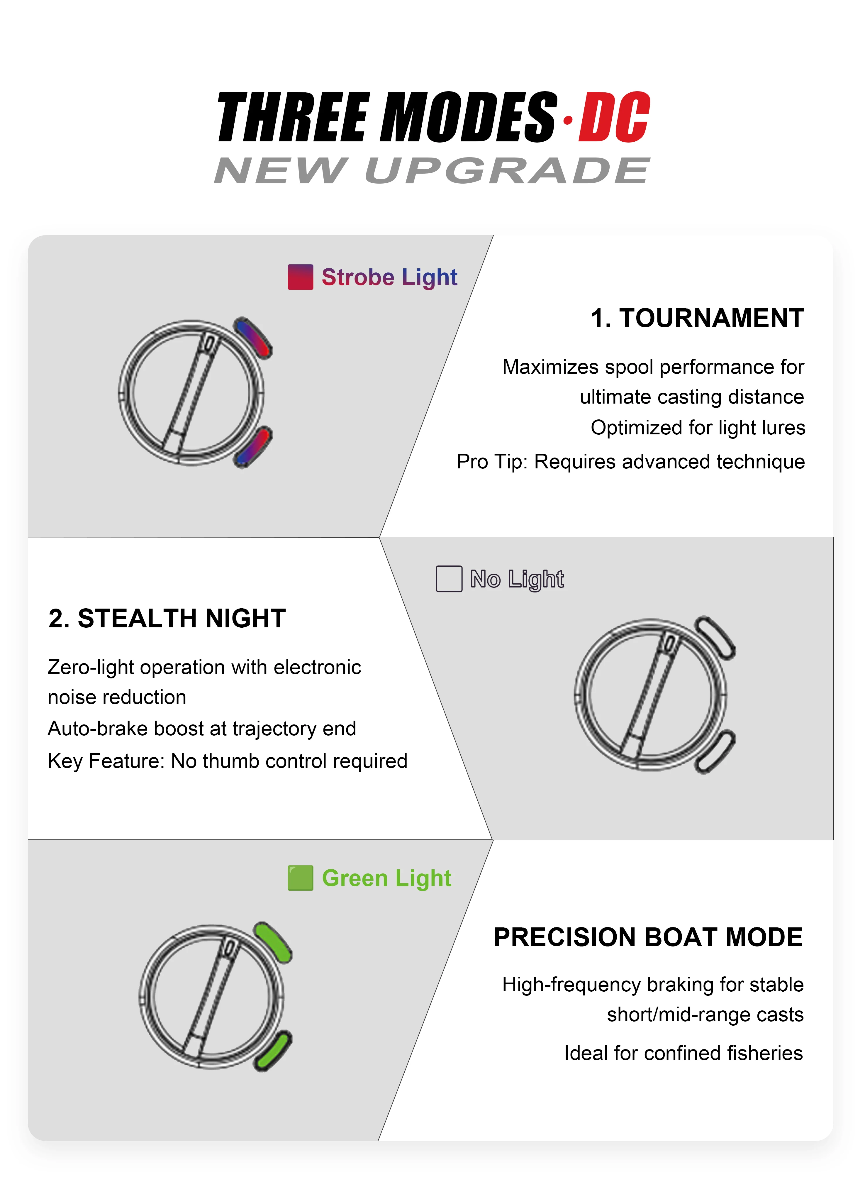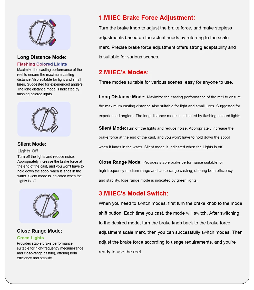 Long Distance Mode: Maximize the casting performance of the reel to ensure the maximum casting distance.Also suitable for light and small lures. Suggested for experienced anglers. The long distance mode is indicated by flashing colored lights.