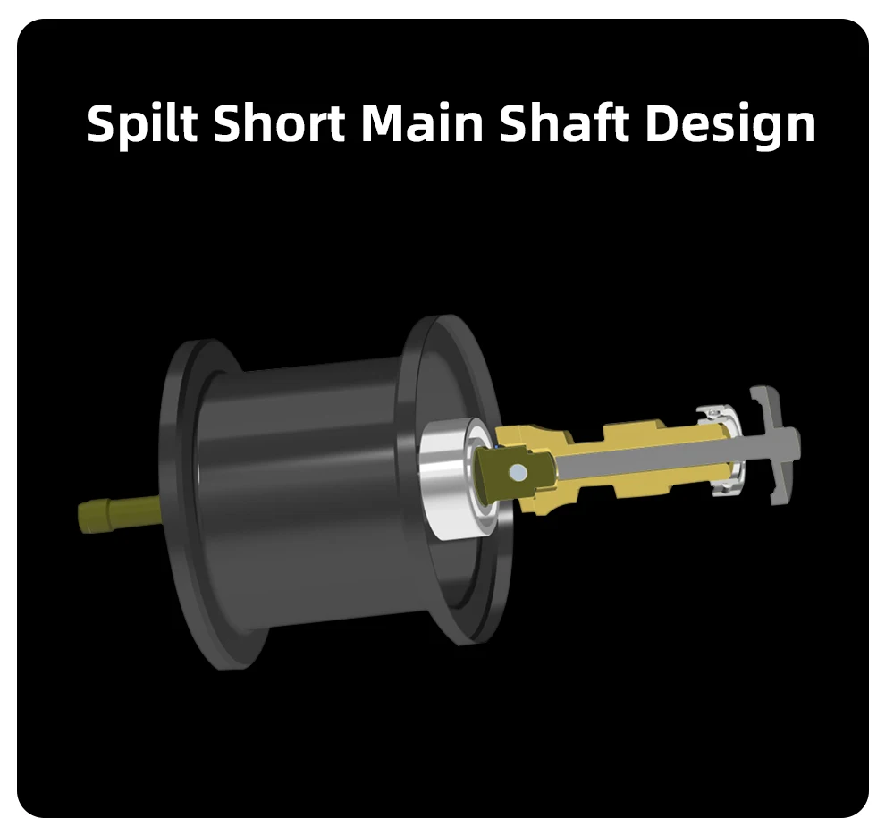 Without a spool shaft design, the spool is supported only by the bearings at both ends. Because there is no spool shaft, the friction during the spool's rotation is nearly zero, resulting in an ideal rotation effect.Two-piece split main shaft effectively reduces casting vibrations and noise, improves casting stability, and increases casting distance.